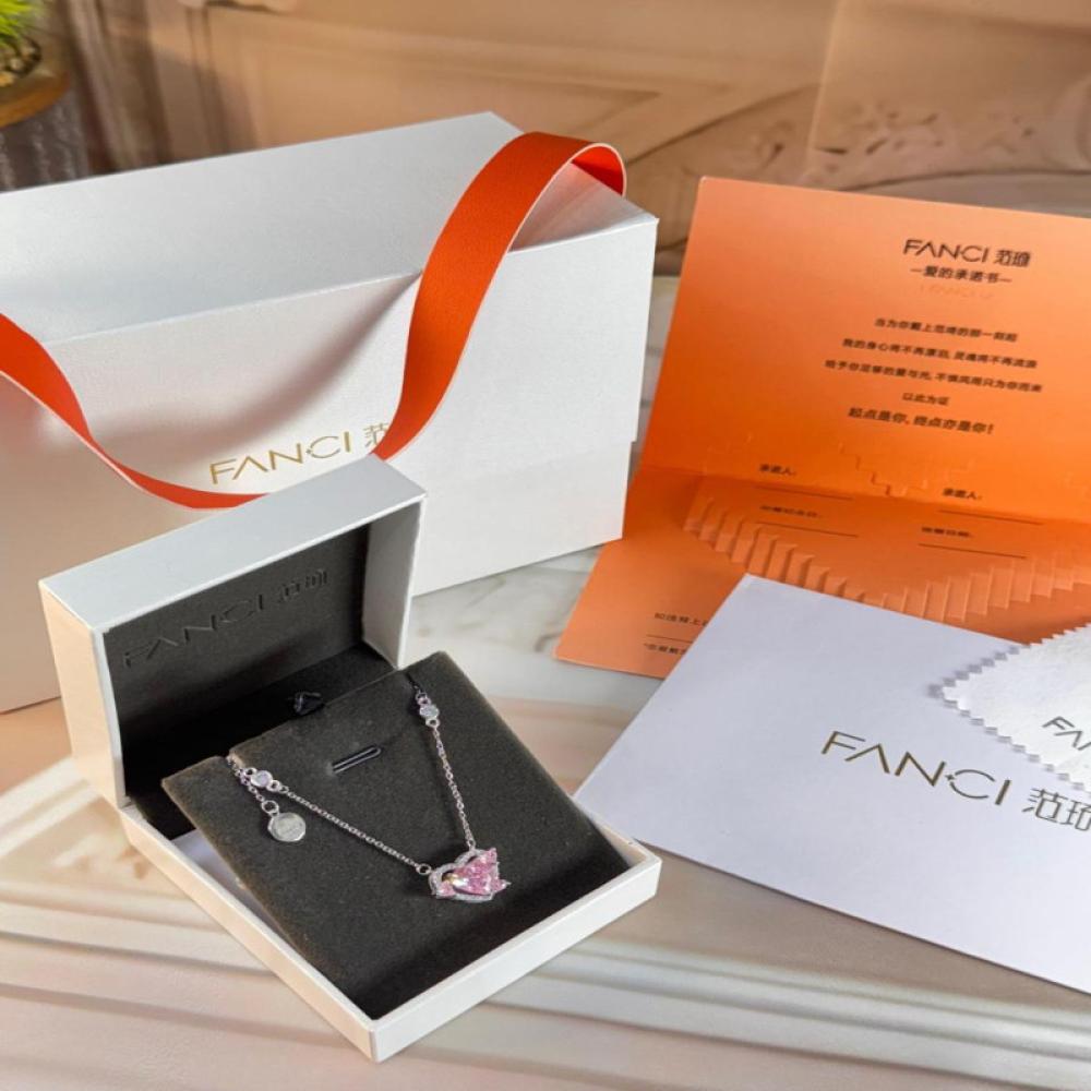 سلسال فانسي بتصميم قلب وردي جذاب يعكس الرقة والأنوثة، مقدم من ماركة FANCI المعروفة بتصاميمها الراقية وتفاصيلها المتقنة. يأتي السلسال في علبة أنيقة مناسبة للإهداء.