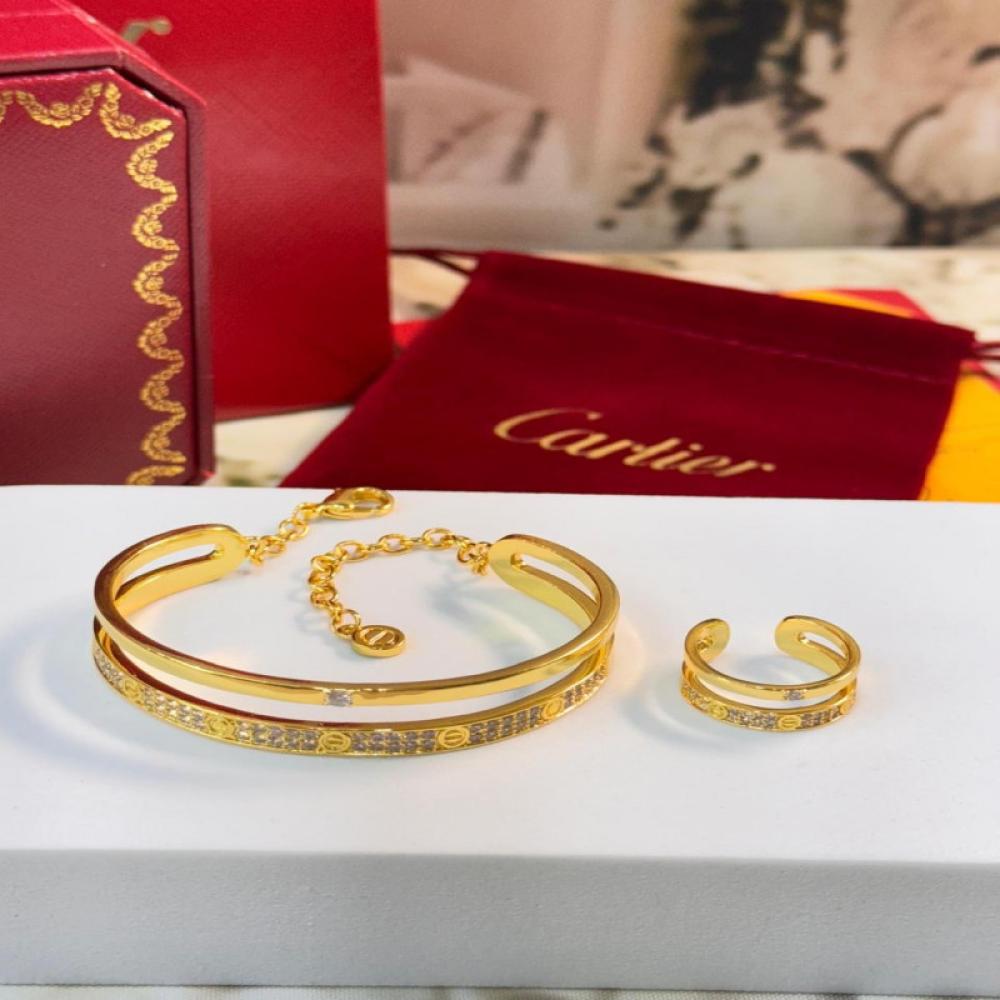اسوارة وخاتم كارتير تصميم راقي وأنيق يجمع بين الفخامة والبساطة، مصنوع من معدن ذهبي مع لمسات من الأحجار اللامعة، ليضفي بريقًا خاصًا على إطلالتك في كل مناسبة.